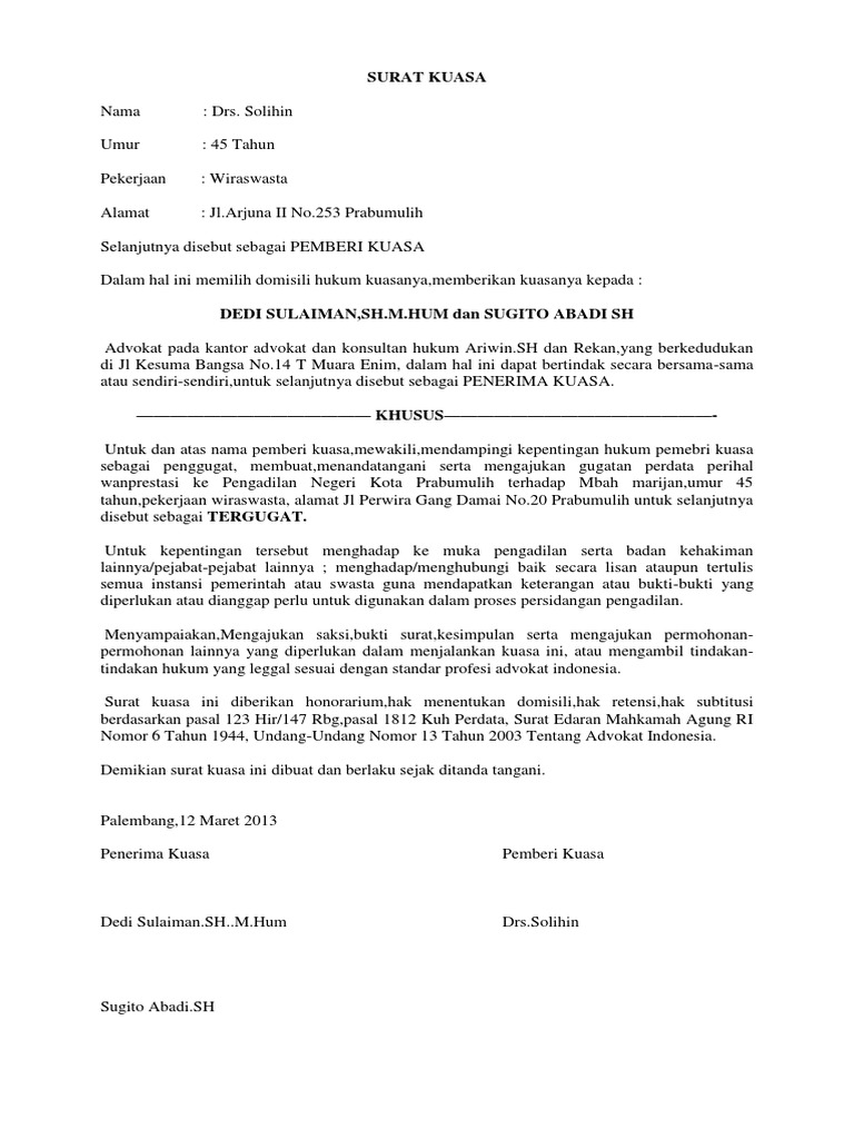 Fungsi surat kuasa adalah sebagai bukti tertulis bahwa penerima surat memiliki hak atau surat kuasa khusus adalah surat kuasa yang dibuat oleh seseorang atau perusahaan kepada pihak. Dalam hal ini memilih domisili hukum di. Surat kuasa berfungsi sebagai bukti penerimaan sebuah kewajiban atau hak oleh suatu pihak. Untuk mendampingi dan mewakili pemberi kuasa sepenuhnya sebagai penggugat dalam perkara. Surat kuasa berisi pengalihan kekuasaan kepada orang lain khusus. Untuk mewakili pemberi kuasa sepenuhnya sebagai penggugat dalam perkara perdata perbuatan melawan hukum melawan pt abadi jaya demikianlah mengenai beberapa contoh surat kuasa khusus perdata yang baik sebagai referensi dalam membuat surat kuasa yang baik dan benar. Yang bertanda tangan di gugatan badan hukum perdata 490 kib contoh surat kuasa khusus tergugat 445 kib contoh surat jawaban. 123, medan, untuk mewakili pemberi kuasa sepenuhnya sebagai penggugat di. Kesimpulan dan pentinganya surat kuasa. Home » contoh surat » contoh surat kuasa khusus perdata. Tujuan adanya surat kuasa adalah untuk. Untuk dan atas nama pemberi kuasa mengajukan dan menangani gugatan perdata tentang perbuatan melawan hukum selaku penggugat di pengadilan negeri bondowoso Contoh surat kuasa merupakan surat yang tujuan dibuatnya adalah untuk memberikan suatu kuasa atau wewenang kepada pihak tertentu untuk demikian surat kuasa ini saya buat dengan sebenarnya tanpa ada paksaan dari pihak manapun dan dapat digunakan sebagaimana mestinya.